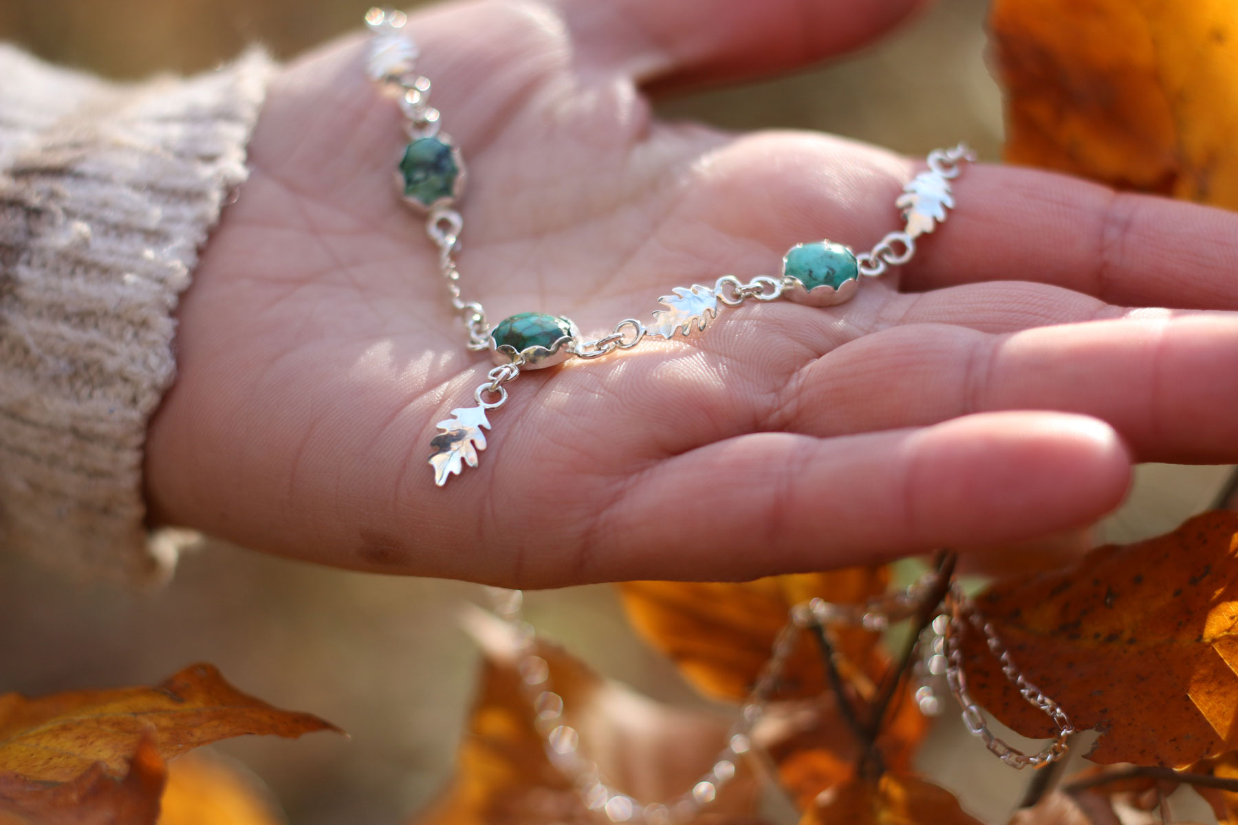 Entre ellas, cinco hojas de roble caladas a mano dan ritmo y textura al conjunto, moviéndose con el cuerpo y atrapando la luz en sus bordes.