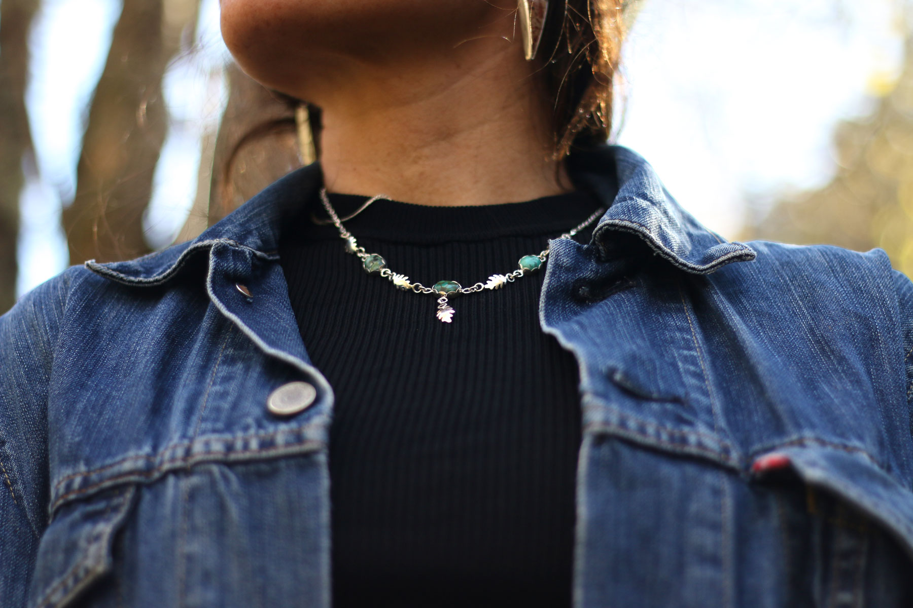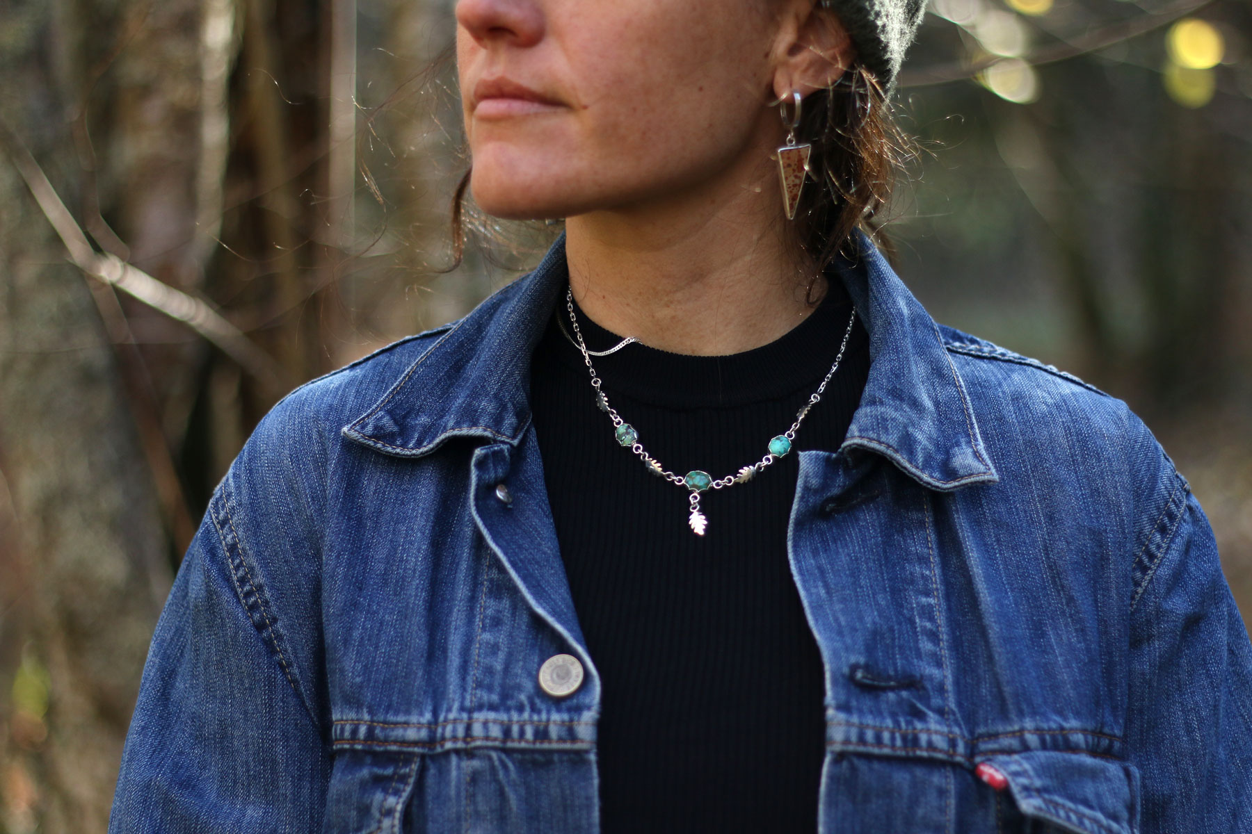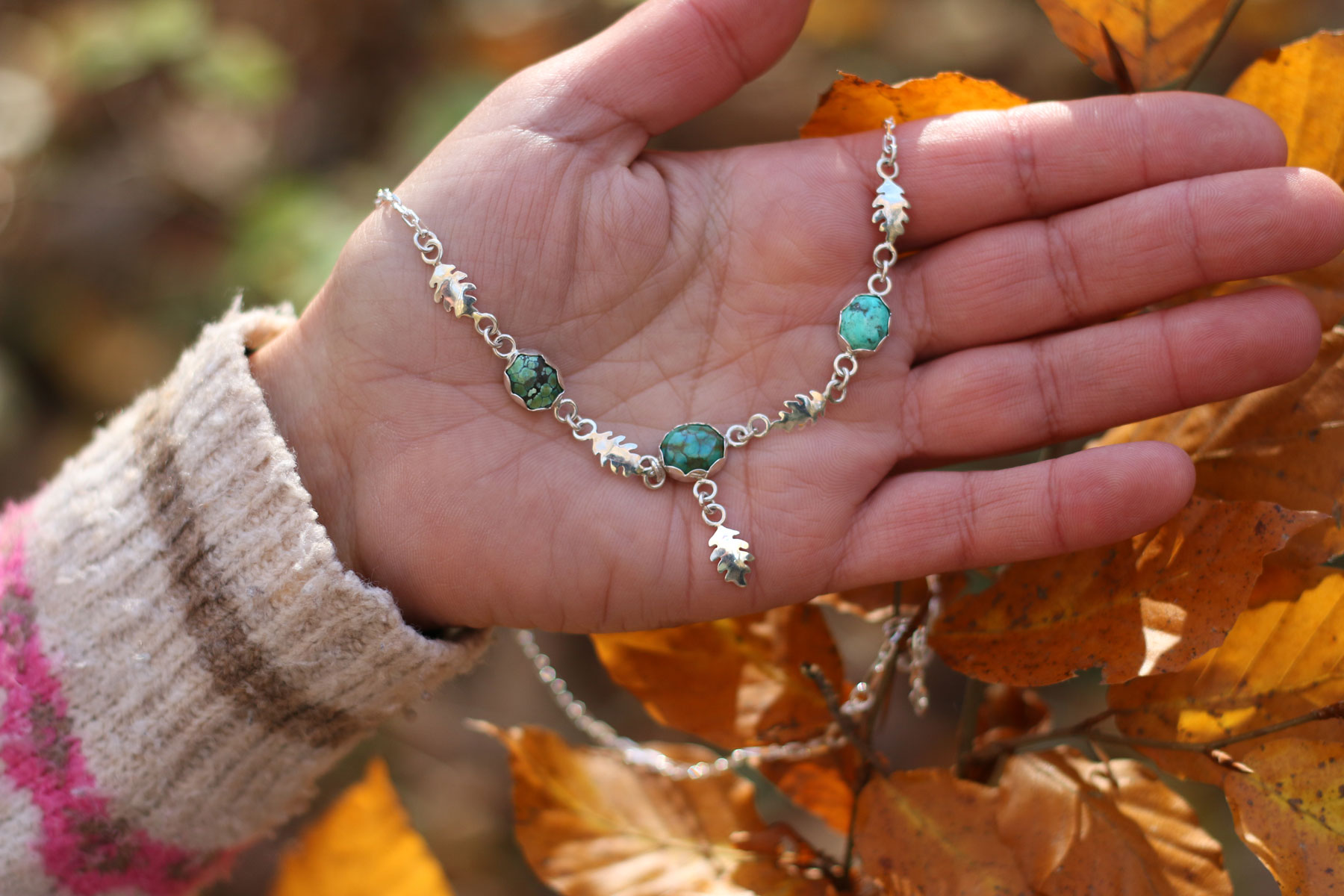 Esta pieza está llena de aire de bosque. En la cadena se reparten tres turquesas azul verdosas, cada una con sus vetas únicas, como pequeñas gotas de cielo entre las ramas.